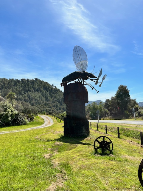 A quick pit stop in St Arnauld for some lunch, we spotted this huge sculpture. Andy had warned us of the mosqitoes along the west coast, and the tiny garage come cafe come general store had 3 whole shelves devoted to insect repelents, so we headed the warnings and sprayed up.